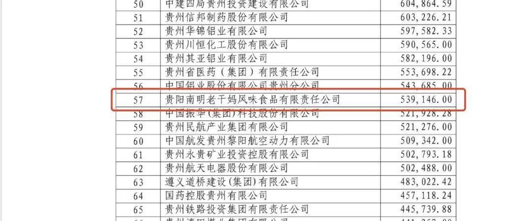 “2025贵州企业100强”榜单显示,老干妈2024年实现53.91亿元营收。 贵州省企业联合会官网截图